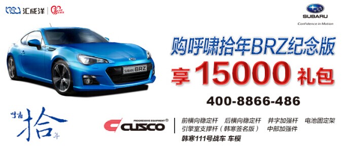 2014年,是斯巴鲁进入中国市场第十个年头。作为中国第一家斯巴鲁经销商,汇成洋斯巴鲁推出BRZ呼啸拾年纪念版回馈车主,BRZ纪念版的优惠最高达15000礼包。