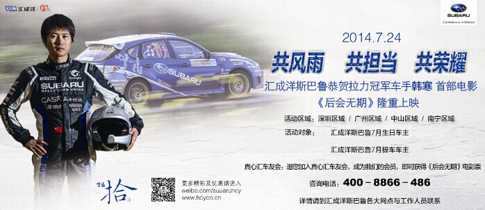 2014年7月24——27日由中山汇成洋斯巴鲁汽车专卖店主办的“我是冠军 赢在斯巴鲁”主题活动利和广场车展,将在利和广场前庭举行!届时中山斯巴鲁首席经销商——中山汇成洋斯巴鲁将携斯巴鲁众主力车型助力韩寒首部处女作《后会无期》。沉稳,内涵,相信斯巴鲁必是您的品味之选!我们期待您的到来!