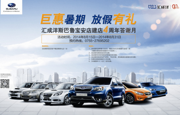 2014年 8月迎来了汇成洋斯巴鲁宝安店建店4周年,在这喜庆的日子到来之际,我们心存感恩,感谢所有斯巴鲁客户的一路相随,正因为有了您们的支持与厚爱,才有了我们的茁壮成长。值此4周年喜庆的日子,为答谢客户4年来对汇成洋宝安店的鼎力支持,汇成洋宝安店特别推出“巨惠暑期,放假有礼”回馈活动。