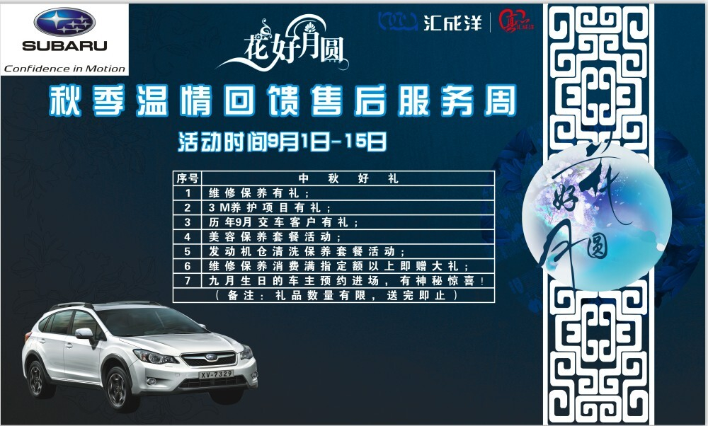 为庆贺中秋,感谢新老车主们的支持和厚爱,9月1日-9月15日中山汇成洋斯巴鲁将推出“花好月圆”秋季温情回馈售后服务周活动。活动期间,售后保养促销大回馈,丰富礼品喜赠送,生日车主更有神秘惊喜!包您满载而归。
