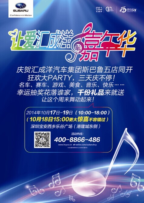 2014年10月17-19日汇成洋斯巴鲁千人欢乐盛会——让爱汇成洋 音乐嘉年华即将举行:各种摊位游戏、亲子游乐项目、千份好礼大派送!汇成洋斯巴鲁邀您参加本次音乐嘉年华,尽情体验我们为您呈现的精彩节目。美食、音乐、游艺、香车美女,10月18日15时更有神秘惊喜降临!汇成洋斯巴鲁专注十二年,五星齐耀。立即扫二维码关注我们,快乐由您做主!