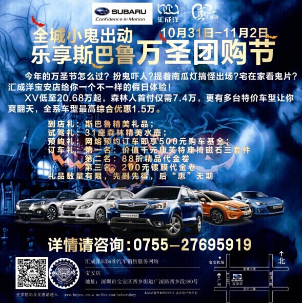 今年的万圣节你打算怎么过呢?是披着床单挂着毛巾到马路上扮鬼吓人?还是扮成自己迷恋的偶像亦或扮成无厘头的模样提着南瓜灯搞怪出场?还是如往常一样宅在家看一夜的鬼片呢?现在我们要对这些循规蹈矩的游戏说goodbye,10月31日-11月2日快来汇成洋斯巴鲁宝安店体验不一样的节日盛宴吧!此次团购会仅限30个名额,更有3台特价车型促销,手快有手慢无。预约热线:0755-27695919