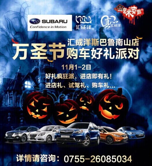 万圣节购车好礼派对,一起来“鬼混”。11月1日-2日汇成洋斯巴鲁南山店携手与您共度万圣节,多款车型优惠到底!活动期间只要您参与店头活动,就有机会获得由汇成洋斯巴鲁南山店提供的万圣节精美礼品一份,数量有限,先到先得。玩转万圣节,我们一起来“鬼混”。活动现场好礼疯狂派, 等着您和您的家人参与进来。