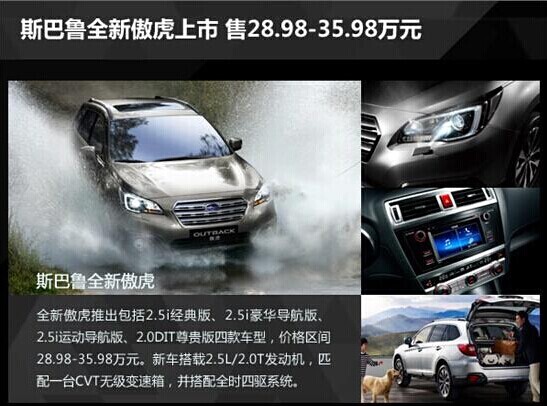 2014年10月22日,斯巴鲁汽车旗下全新一代傲虎正式登陆中国。全新傲虎Outback包括2.5i经典版、2.5i豪华导航版、2.5i运动导航版、2.0DIT尊贵版四款车型,价格区间为28.98-35.98万元。新车将搭载2.5L/2.0T发动机,匹配一台CVT无级变速箱,并搭配全时四驱系统。外观方面,新一代傲虎的外观参考了VIZIV-2概念车的设计理念。新车前脸采用六边形进气格栅,前大灯组融入C型LED日间行车灯,造型非常犀利。配置方面,新一代傲虎全系标配自动大灯、电动调节/折叠外后视镜、10向电动调节驾驶座、驾驶座记忆、前/后排座椅加热、电子手刹、双区空调、感应式雨刷、多功能方向盘、换挡拨片、定速巡航、蓝牙免提系统、倒车影像等功能性配置。斯巴鲁南山店现已全面接受预订。