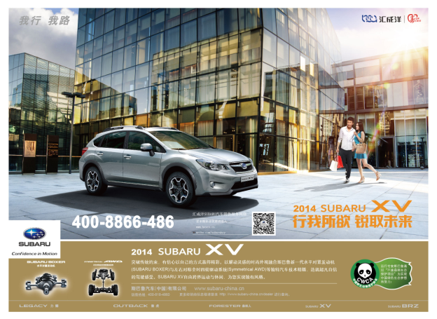 都市新锐 SUV——SUBARU XV,2013年由斯巴鲁中国拉力车队主力车手韩寒倾力代言,以“都市中的激情”为设计理念、以满足城市多元化生活需求为目标,通过前卫动感的外观设计、稳定优异的动力性能、宽敞的车内空间、舒适便利的车内配置,将运动与休闲融为一体,在燃油效率、驾驶乐趣与时尚、个性外观之间达成最佳平衡。