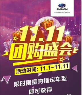 活动主题:汇成洋斯巴鲁红岭店双11 限时限量团购盛会