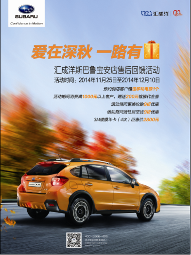 2014年11月汇成洋斯巴鲁宝安店在建店4周年并在深秋之际,推出“爱在深秋,一路有礼”售后回馈活动。在这喜庆的日子到来之际,我们心存感恩,感谢所有斯巴鲁客户的一路相随,正因为有了您们的支持与厚爱,才有了我们的茁壮成长。值此深秋喜庆之月以及感谢客户4年来对汇成洋宝安店的鼎力支持。