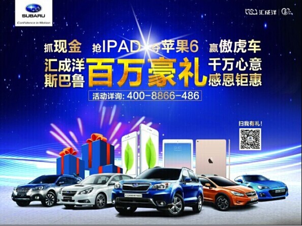 即日起至2015年1月30日,凡到汇成洋斯巴鲁订购车客户,都可以在2015年1月30日下午18:00点参加由深圳市公证处监督下抽出3台赢傲虎优惠大奖;中奖者,将可以获得每台优惠10万元购买2015款新傲虎的资格。