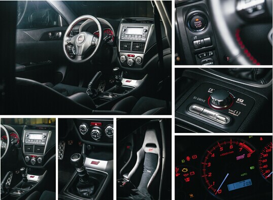 内饰方面,STI 依然延续了其历代车型在内饰设计上简洁、运动的风格。仪表盘亮度可调、车外后视镜带一键折叠功能。短小强悍的手刹手柄加上真皮包裹,行程较短,着实有不错的手感。。。一键启动按键设计很特别,在方向盘左边而非传统的中控台旁边。坐垫和靠背处为翻毛皮材质,以提供足够的摩擦力。看到包裹性极佳的座椅你会想起什么?激烈驾控?极致甩尾?我看行!